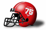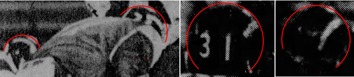 A visitor to this website has reported the "discovery" of an apparently previously-unknown helmet design used by the Alouettes during at least the first two regular-season games of the 1975 season (at Hamilton and vs Saskatchewan); below are some cropped photographs from archival newspapers showing what appears to be an arched word logo (presumably the team name) on the sides of the (presumably) blue helmets. An outline has been added to clarify the location of the helmet shell.